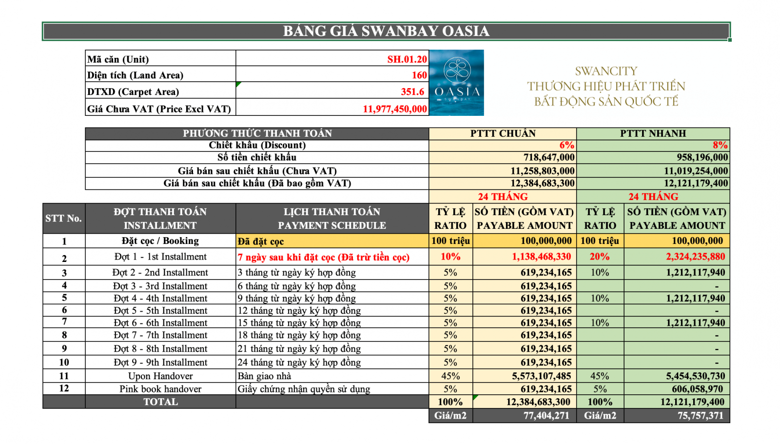– Biệt thự: Gồm nhiều loại hình biệt thự: song lập + cảnh quan, biệt thự ven sông và còn có cả Dinh thự. Khu biệt thự được quy hoạch dọc bến du thuyền, cạnh công viên ven sông. Cụ thể: